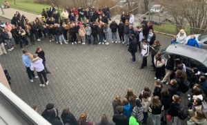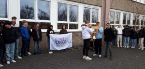 Ebenso die Botschaft: „Ihr seid nicht alleine, wir vergessen euch nicht.“ So klang es auch am 24.02.2023, dem traurigen Jahrestag des Überfalls auf die Ukraine. An diesem Tag hatte die AG-Geschichte zum gemeinsamen Gedenken in der 2. Pause zum Friedensläuten vor die Hermann-Gmeiner-Realschule plus eingeladen. Sie hatte zusammen mit ihren beiden AG-Leitern, Simon Imhäuser und Lars Limbach, eine Schweigeminute und eine kurze Ansprache vorbereitet, die im täglichen Friedensläuten mündete.