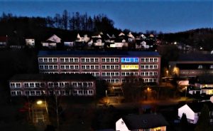 Am Abend leuchtet unser Lichtfenster über das ganze Wochenende in den ukrainischen Farben