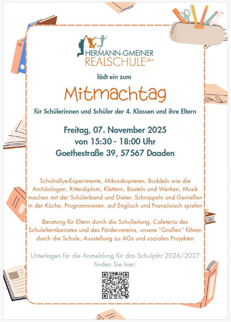 Herzliche Einladung zum Mitmachtag an der HGS Daaden – 07.11.2025 15:30-18:00 Uhr